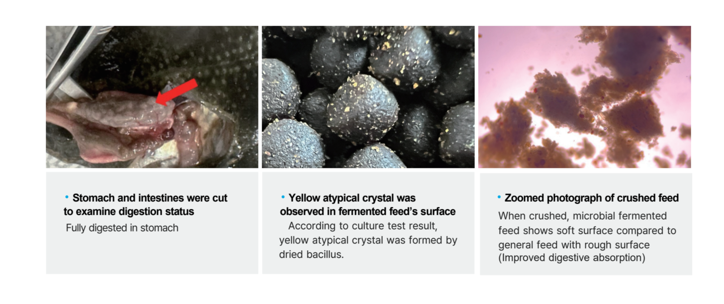 We use microbial fermented feed to reduce the use of antibiotic and keep the fish healthy. This technology completed a microbial culture test and proved digestive absorption improvement and health management effects. It is currently under patent application.